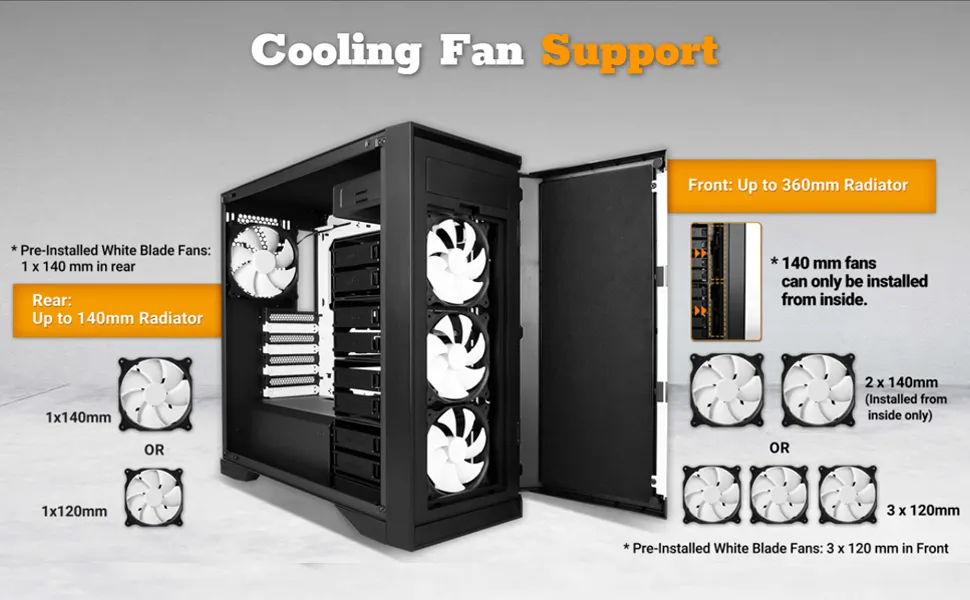 Fan Support : 3 x 120mm or 2 x 140mm(Installed from inside only) Front , 1 x 120mm or 1 x 140mm Rear,