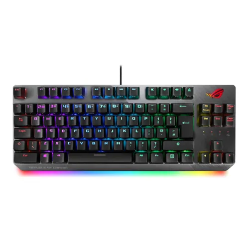 ACTION READY. CRAFTED COMPACT. ROG Strix Scope TKL is a compact, tenkeyless mechanical keyboard with Xccurate Design – an extra-wide Ctrl key that's easier to feel and find in the FPS frenzy. With a choice of Cherry MX switches for optimal feel and reliability, an all-aluminum top plate for strength and style, and more customizable Aura RGB lighting than we've ever engineered into a ROG keyboard, Strix Scope TKL empowers you to play like a pro and rise above the battlefield crowd. TKL FORM FACTOR FOR FPS ROG Strix Scope TKL is a high-performance mechanical gaming keyboard with a small footprint, freeing up space on your worktop for broader mouse movements – perfect for the lower sensitivity settings that slow the reticle for leveled-up aiming accuracy. The keyboard is topped with an aluminum faceplate for everyday resilience, and finished with a striking slash aesthetic for a little touch of style. READY FOR DAY & NIGHT The Quick-Toggle Switch prepares ROG Strix Scope TKL for gaming or the daily grind, toggling the top row between media or function (Fn) key input – so it's easy to switch modes for work or play. INSTANT PRIVACY A quick tap of ROG Strix Scope TKL's Stealth key instantly hides all apps and mutes all audio, assuring privacy the moment you need it. Decorated with an iconic cloaked-figure motif, a second push of Stealth puts everything back to just the way it was. AURA SYNC ROG Strix Scope TKL is loaded with vibrant RGB illumination for you to command. There's an individual RGB LED under every key, RGB lock indicators and an RGB ROG logo. It even projects an arresting RGB underglow from below, extending the lighting beyond the keyboard. Powered by Aura Sync, the entire color spectrum and a range of dynamic lighting effects are at your command to create a complete system that's uniquely yours. Strix Scope TKL's lighting is also easily synced with the extensive Aura ecosystem, so it's easy to build a gaming environment that really shines. ARMOURY II Armoury II is an enhanced driver-based software that offers more extensive controls. An intuitive UI lets you easily tune ROG Strix Scope TKL to suit your gameplay – create profiles, customize colors and lighting effects, map keys, record macros and more. You can even track hardware stats during gameplay for data analysis. CHERRY MX RGB MECHANICAL SWITCHES Constructed with Cherry MX RGB switches, ROG Strix Scope TKL delivers the precise mechanical feel preferred by gamers and enthusiasts alike. The premium-quality switches are manufactured in Germany, and are renowned for offering optimal actuation and responsiveness with every keystroke. Cherry MX Gamers love responsive mechanical keystrokes, so Cherry MX switches were the obvious choice for ROG Strix Scope TKL. The attention to detail that results in innovative features like the enlarged Xccurate Design Ctrl key, made with FPS players in mind, excites us greatly. Features Created for FPS Gamers: the tenkeyless form factor provides more room to move the mouse, while the enlarged L-Ctrl key minimizes inadvertent pressing of other keys Portability: The compact keyboard fits easily into backpacks while the detachable cable prevents scuff marks or scratches Quick-Toggle Switch: Instantly shift between function and media key inputs Stealth key: Tap to hide all apps and mute audio for instant privacy; tap again to play on Cherry MX switches: German-made, micro-switched actuators for precision input with tactile feedback Durable construction: Aluminum top-plate with striking slash aesthetic combines resilience and style Technical Details Brand : Asus Model : STRIX-SCOPE-TKL-RD Key Switch : Cherry MX RGB: Red Connectivity : USB 2.0 Size (Full/TKL) : 80% Actuation Force : 45g Lighting : Per-Key RGB LEDs AURA Sync : Yes Anti-Ghosting : N-Key Rollover Cable : Detachable 1.8m braided USB cable OS : Windows® 10 Weight : 880g with cable Color : Black and Gray Macro Keys All keys programmable - except Fn USB Report rate : 1000 Hz Profile Hot Keys : Fn + 1 / 2 / 3 / 4 / 5 / 6: Profile 1 - 6 (6 is default profile) Lighting Effects Hot Keys : Fn + Right or Fn + Left Brightness Setting Hot Keys Fn + Up: Brightness up (5 levels) Fn + Down: Brightness down (5 levels) Clear On-Board Memory Hot Keys Hold Fn + Esc for 15 seconds Macro Hot Keys Step 1: Fn + Left-ALT to start recording Step 2: Fn + Left-ALT to end recording Step 3: Assign Macro Key Media Hot Keys Play/Pause (F5), Stop (F6), Previous (F7), Next (F8), Mute (F9), Volume Down (F10), Volume Up (F11). Stealth Key (F12) Software Armoury II Armoury Crate Dimensions 356 x 136.2 x 39.7mm 356 x 136.2 x 39.7 mm (keyboard) Contents 1 x ROG Strix Scope TKL keyboard 1 x Detachable braided USB Type-A to Type-C cable 2 x ROG stickers 1 x Quick Start Guide 1 x Warranty booklet