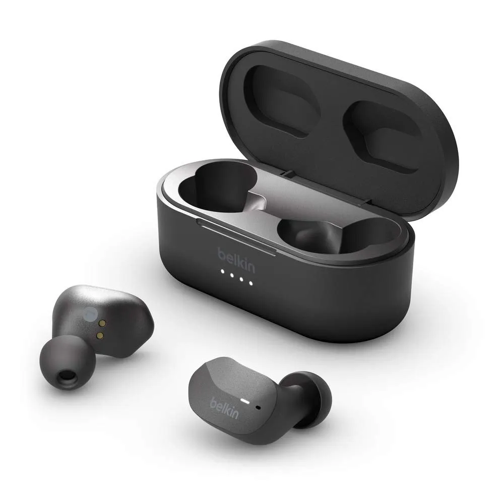 SoundForm True Wireless Earbuds Enjoy the freedom of true wireless earbuds with immersive sound and a comfortable fit. Immersive sound that doesn’t quit. Crystal-clear sound with powerful bass that keeps you motivated throughout your day (be it at the office or gym). An IPX5 rating means they’re sweat and splash resistant. The fit provides a seal for noise isolation and is comfortable enough to wear all day. Experience the comfort, convenience, and quality of Belkin sound with the SoundForm True Wireless Earbuds. Meticulously crafted and designed for your active life, these IPX5-rated sweat and splash resistant earbuds provide comfort and protection from moisture. Get lost in enhanced deep bass and crystal clear mids and highs - at any volume - all while reducing outside interruptions with a comfortable and adjustable sealed in-ear fit. With intuitive touch controls and one-step Bluetooth® pairing, these wireless earbuds are ideal for those on the go, at home, or at the office. The stylish and compact charging case provides an extended charge when you need it, up to 24 hours of playtime.