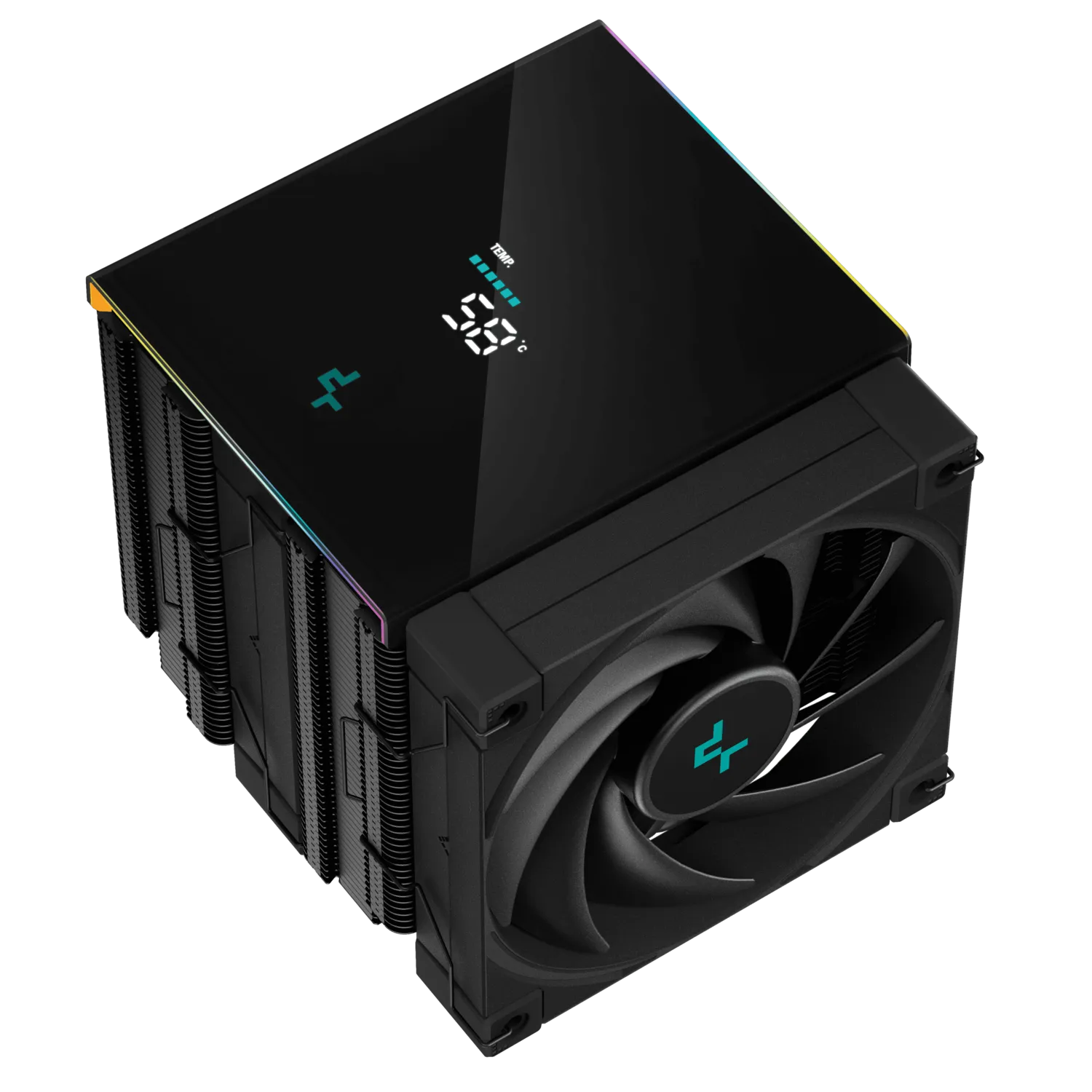 Features: The era of digital air coolers has arrived, and DeepCool is proud to introduce the AK620 DIGITAL. Everything you loved about the AK620 ZERO DARK, but with a sleek low-profile magnetic status display and ARGB LED strips. REAL-TIME STATUS SCREEN The crystal-clear digital screen displays the temperature and usage of your system's CPU in real time, and there is also a high temperature warning. The display is controlled via a simple application that only requires an open USB 2.0 header. PROVEN AK ZERO DARK DESIGN An all-black edition of the dominant AK620 high-performance CPU cooler. The same premium quality materials, featuring six advanced copper heat pipes, a pure copper coldplate, a dense dual-tower heat sink, and two silent FDB fans, produce a powerful winning formula for high performance cooling in a ZERO DARK raven design. UNLOCKED POTENTIAL Achieve peak performance on your CPU with substantial cooling capacity for high frequency overclocking. The AK620 DIGITAL features maximum heat dissipation power and improved airflow to lower temperatures during demanding system applications. COOL, QUIET, AND POWERFUL Two powerful PWM fans with superior fluid dynamic bearings offer low noise operation without losing cooling output for a perfect balance. SIMPLE AND SECURE INSTALLATION The provided all metal mounting bracket provides an easy installation process that ensures proper contact and equal pressure on both Intel® and AMD platforms.